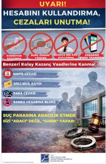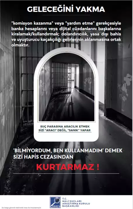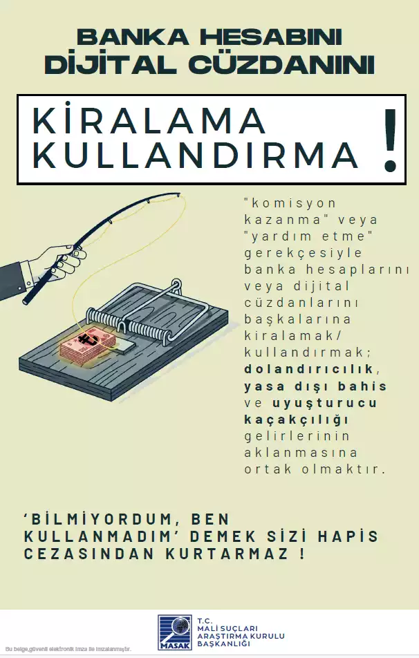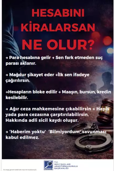 Son dönemde üniversite öğrencilerine ait banka hesapları ve dijital cüzdanların üçüncü kişiler tarafından kullanılması suretiyle dolandırıcılık, yasa dışı bahis ve uyuşturucu kaçakçılığı gelirlerinin aklanması gibi olaylarda ciddi artış yaşanmaktadır. Kendi adınıza kayıtlı banka hesaplarınızın veya dijital cüzdanlarınızın; “komisyon kazanma”, “borç ödeme yardımı”, “sadece bir kez kullanma”, “zararsız para transferi” veya benzeri gerekçelerle başkaları tarafından kullanılmasına bilerek ve isteyerek izin verilmesi, Türk Ceza Kanunu ve ilgili mevzuat kapsamında cezai ve hukuki sorumluluk doğurabilir. Hesaplarınız üzerinden gerçekleştirilen işlemlerden, işlemi fiilen yapan kişi kim olursa olsun, hesap sahibi olarak siz sorumlu tutulabilirsiniz. Hesaplarınızı başkalarına kullandırmanız durumunda; adli soruşturma ve kovuşturmalara muhatap olmanız, adli sicil kaydı oluşması, bankalar tarafından riskli müşteri olarak değerlendirilmeniz, banka hesaplarınıza kısıtlama getirilmesi, kredi ve kredi kartı başvurularınızın reddedilmesi, adli kontrol tedbirleri (yurtdışı çıkış yasağı dâhil) uygulanması ve mağdurlar tarafından tazminat davaları açılması söz konusu olabilir. Bu tür durumlarda “bilmiyordum”, “yardım etmek istedim” veya “sadece aracıyım” şeklindeki açıklamalar hukuken koruyucu olmayabilir. Tanıdığınız ya da tanımadığınız kişilerden gelen, hesap veya IBAN paylaşımı karşılığında kazanç vaadi içeren her türlü teklifi reddetmeniz ve şüpheli durumları derhâl güvenlik yetkililerine bildirmeniz önem arz etmektedir.